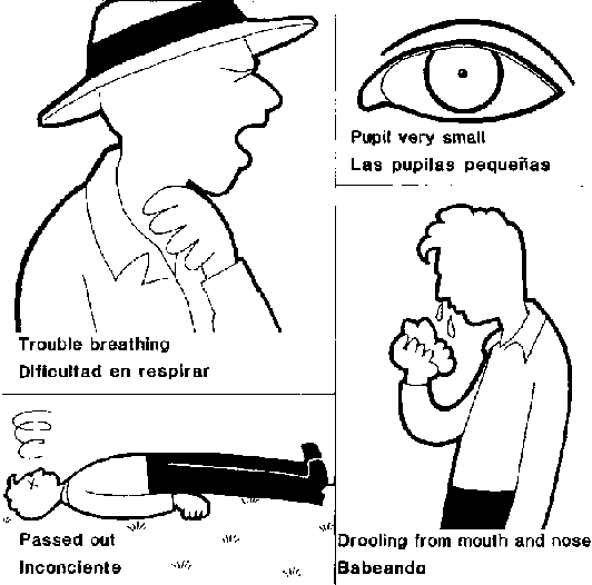 Trouble breathing, drooling from the mouth and nose, the pupil in