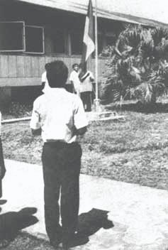 Izando la bandera en el Centro de Salud de Caballococha (Frontera Perú - Colombia - Brasil)