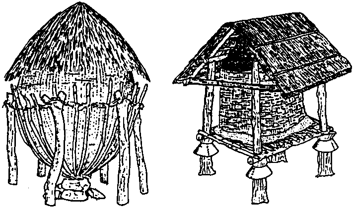 Semi-open storage structures are particularly widespread in semiarid regions. They include containers made of woven twigs or straw as well as wooden frames with a straw mat on which the commodities are placed. Crops are generally stored in an unthreshed state, i.e. in cobs or panicles. Contact to the ground is prevented by means of stone foundations so that ground moisture cannot penetrate into the store. A straw roof affords protection against the rain.