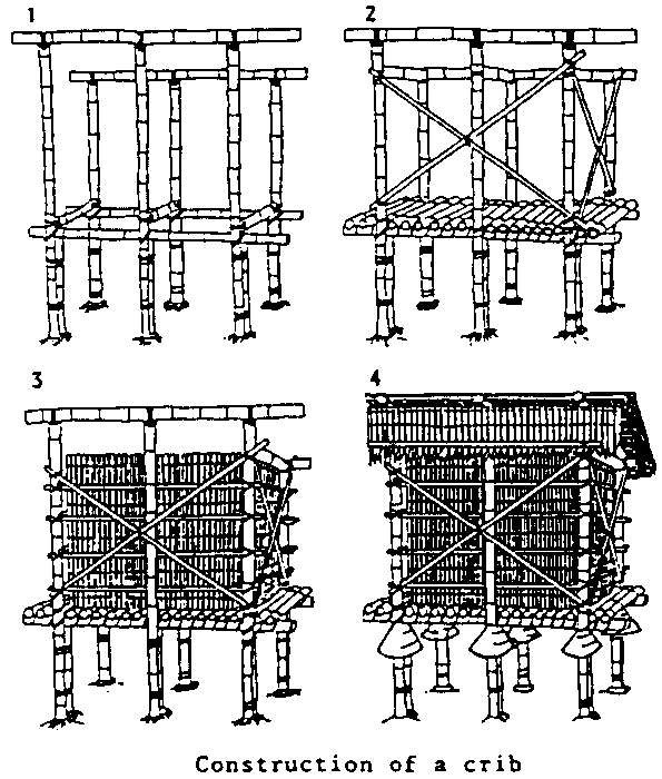 A drying frame or crib, developed in Nigeria, has proved to be of exceptional value, particularly in drying maize cobs. The crib consists of a wooden or bamboo frame with walls made of wire mesh or wooden slats and a thatch roof it has a maximum width of 60 80 cm. This guarantees good aeration and drying, even in humid regions. The cobs are left in the crib for up to 3 months, depending on weather conditions, and thereafter put into the store. In some areas these cribs also serve as stores.