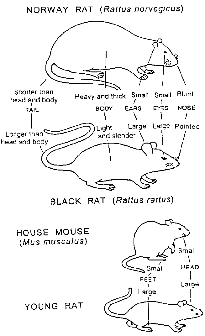 Distinguishing features of species are the size and shape of the body, the colour of the fur, the length of the head and body in relation to the tail, the size of the hind feet, the relative size of ears and eyes and the shape of the snout. The size and colour of the animals can vary greatly 50 that they arc not sufficient to provide an adequate means of identifications. It is of practical use to catch a number of animals using traps, for example, in order to be able to identify them clearly. In many countries plant protection services or institutes have departments specialized in rodents which can be consulted if necessary.