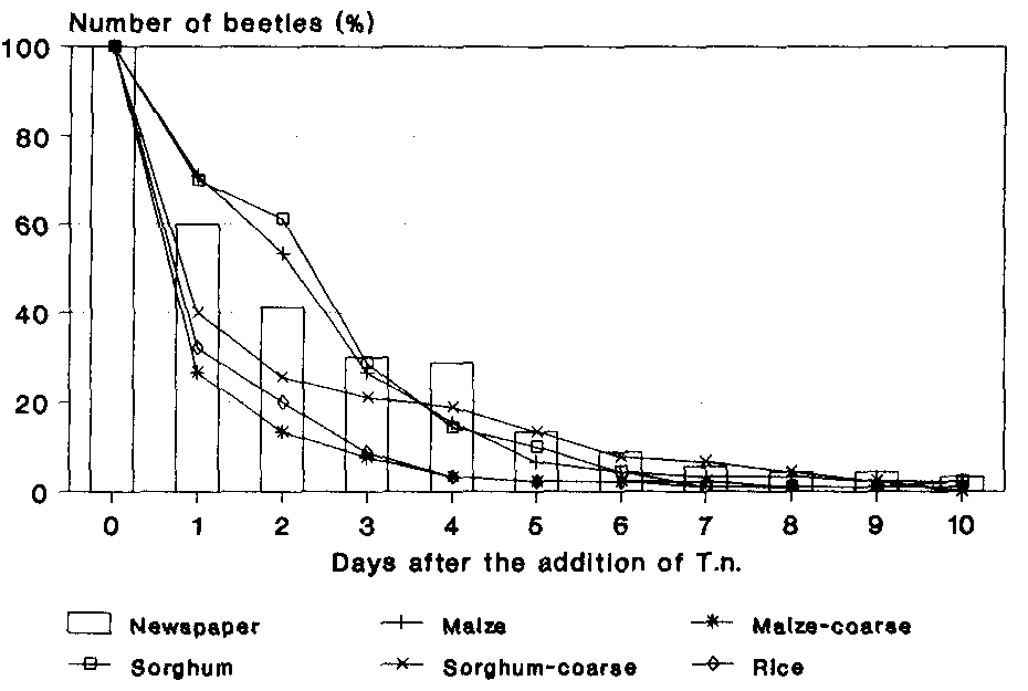 The beetles left more quickly than the newspaper. There were more beetles left only on maize, sorghum, coffee beans and coarsely ground coffee beams. On the third day, the proportion of T. nigrescens found on the substrates had, however, also fallen to a level comparable to the control. The products evidently had no special attraction for the beetles. In total, an average of 82% of T. nigrescens had left after 3 days, and after 5 days, this already amounted to 93%. No tendency could be observed for a larger number of adult T. nigrescens to remain on any of the substrates for a longer period of time.