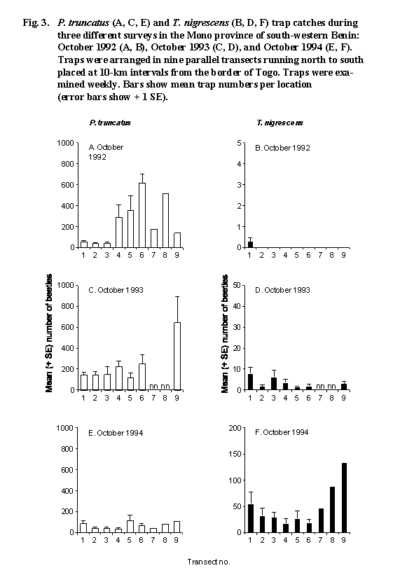 When the flight activity of P. truncatus and T. nigrescens in the Mono province was monitored between April 1992 and October 1997 (Fig. 5), the flight activity of P. truncatus was strongly seasonal, with two peaks in trap catches, especially in the early years of the study. The first peak occurred between the end of December and the end of February, during the major dry season in southern Benin, and the second one between April and June, during the first part of the rainy season. The lowest flight activity of P. truncatus was always recorded in October. The December to February peaks of 1994-1995 and especially of 1995-1996 and 1996-1997 were notably lower than in previous years. Moreover, the April to June peak in 1996 and the flight activity in April and May 1997 were strikingly low compared with the previous years.