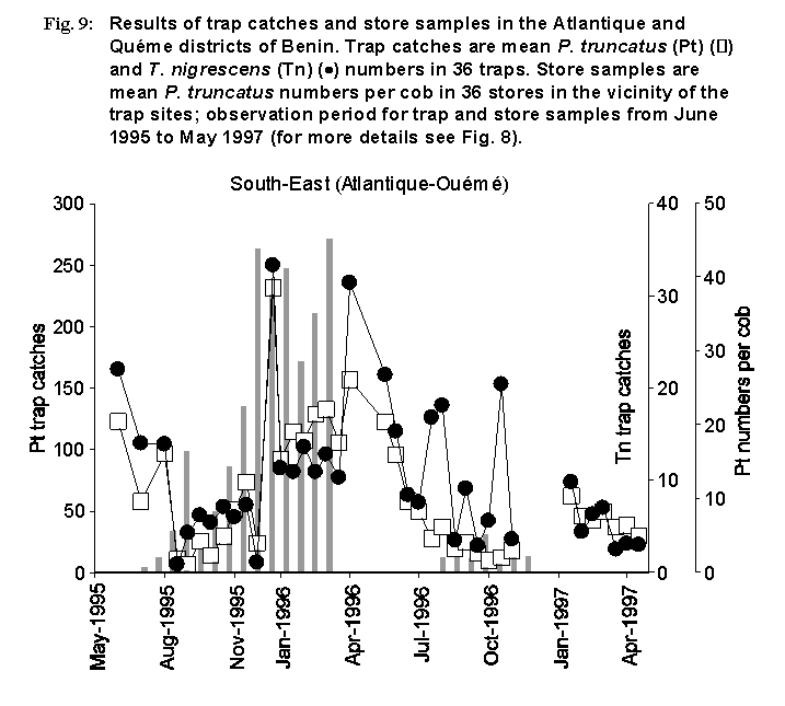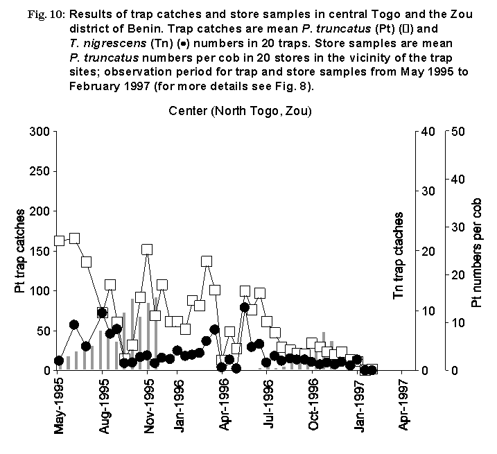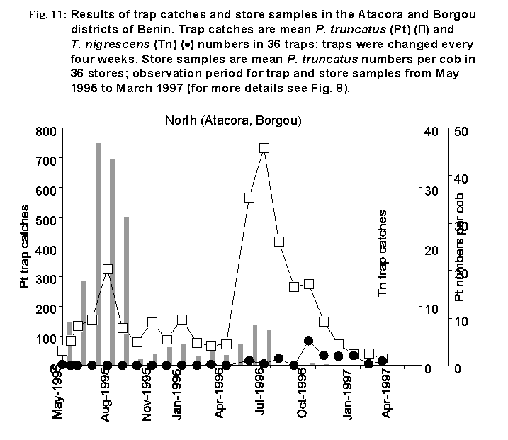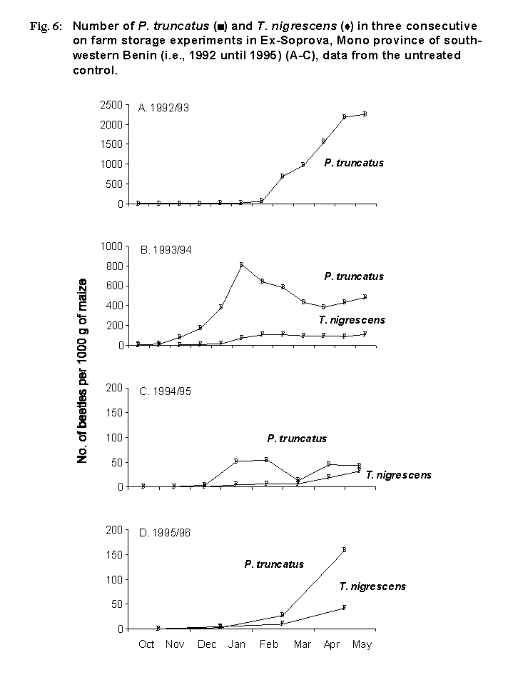 The results from the four consecutive on-farm storage experiments clearly demonstrated a very considerable reduction of P. truncatus infestation, accompanied by a reduction of grain losses and increasing T. nigrescens densities. The maximum level of grain losses recorded in the 1994-1995 and in the 1995-1996 trial corresponds well with the average grain losses after six months of storage reported for southern Togo prior to the introduction of P. truncatus (Pantenius, 1987). Mutlu (1994), in her study in southern Togo, found lower P. truncatus infestation in grain stores in villages where T. nigrescens had been released, compared with non release villages.
