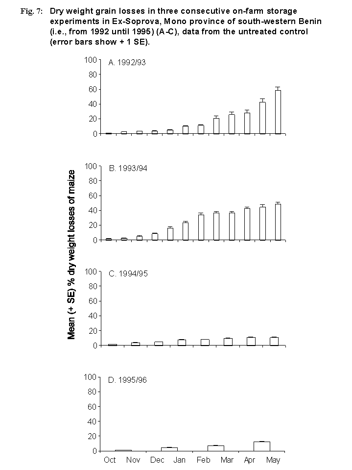 Data from the untreated controls of four storage trials, carried out on the same farm (near Dogbo, Mono Province) in consecutive years, are presented here. The same maize cultivar, 'TZSR-W' (Tropical Zea mays, Streak Resistant-White), an improved, tropical adapted, floury 120-d IITA variety, was used in all trials and was planted on the farm during the respective major growing season (i.e., between April and August). The experiments were carried out between September and April of 1992/1993, 1993/1994, 1994/1995, and 1995/1996. The design and the amount of maize stored in the grain stores varied between the experiments, but in all trials cobs were stored with husks intact, in stores similar to traditional local stores. In the 1992/1993 experiment, 80 cobs per replicate (with a total of three replicates per treatment) were collected on each sampling occasion, and in the 1993/1994, 1994/1995 and 1995/1996 trials, 150 cobs were sampled per replicate (with a total of three and four replicates per treatment, respectively). The moisture content of the maize was determined using standard oven-drying techniques (ISO 1980). Sampled cobs were dehusked, shelled, and sieved to collect all adult insects. The data are expressed as mean numbers of P. truncatus and T. nigrescens per kilogram of dry-matter grain. Grain loss was measured using the count and weigh method (Harris & Lindblad, 1978), with 15 replicates per sampled store.