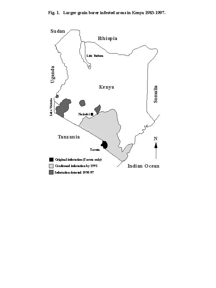 Since the first outbreak in 1983 (Kega & Warui, 1983), LGB has been confined to the southeastern districts of Kenya (largely a maize deficit zone). However, the threat for LGB to spread to the principal maize growing areas has always loomed large especially with the advent of liberalised maize trade policy that came in force in 1994. It is against this background that an Integrated Pest Management Initiative for LGB, funded by UK ODA (Overseas Development Administration), was launched in Kenya during 1990 to 1993. The broad aims of this initiative were to reduce the impact of LGB on farm-stored maize through the development of an integrated pest management strategy for important post harvest pests of maize. Various approaches were adopted including national monitoring for LGB distribution, implementation of phytosanitary regulations, studies on ecology of LGB, chemical, biological and cultural control measures.