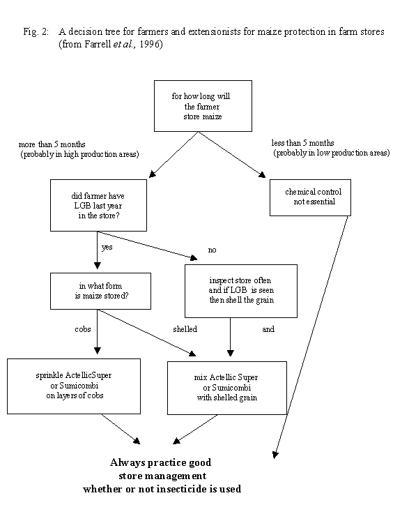 The foregoing activities have been integrated and an IPM package has been formulated for use by extension staff and farmers to decide on the most cost-effective approach for the control of post-harvest pests in Kenya (Farrell et al., 1996). A decision making matrix provides a useful guide on what a farmer should do under different circumstances (Fig. 2). There are, however, a number of challenges that are yet to be met to realise a more integrated IPM package for storage pests in general and LGB in particular. These comprise: