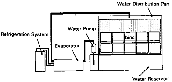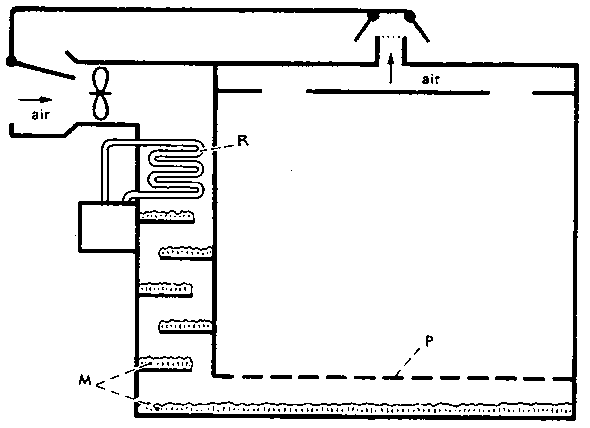 For a more permanent system of high relative humidity in the storage environment, moisture can be added to the refrigerated air. A fan draws air past the refrigerator's evaporator coils (R) then past wet moss or straw (M). The moist air is then pulled into the store-room through a perforated wall (P).