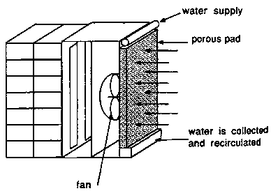 Evaporative coolers can be constructed to cool the air in an entire storage structure or just a few containers of produce. These coolers are best suited to lower humidity regions, since the degree of cooling is limited to 1 to 2 C (2 to 4 F) above the wet-bulb temperature. A cooling pad of wood fiber or straw is moistened and air is pulled through the pad using a small fan. In the example provided here, O. 5 gallon of water per minute is dripped onto an 8 square foot pad, providing enough moist air to cool up to 18 crates of produce in 1 to 2 hours. Water is collected in a tray at the base of the unit and recirculated.