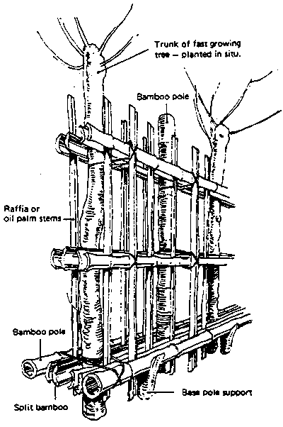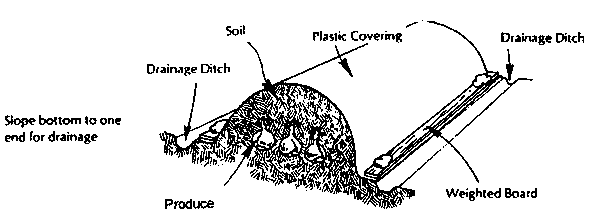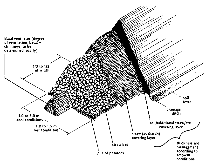 When storing potatoes, a field storage clamp is a low cost technology that can be designed using locally available materials for ventilation and insulation. The example illustrated here employs a wooden ventilator box and straw for insulation. The entire pile of potatoes and straw is covered with a layer of soil, which should not be highly compacted. In very cold regions, a second layer of straw and soil can be added. In hot regions, less soil is needed, but more ventilation can be added by constructing chimney type air outlets at the top of the clamp.