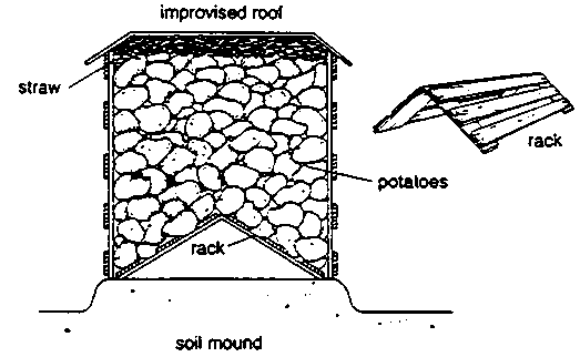 For large quantities of potatoes, a self-supporting A-frame storehouse can be constructed. A pit is dug about 10 feet deep and wooden air ducts are placed along the earthen floor. The roof of the building is constructed of wood, then covered with straw and soil.