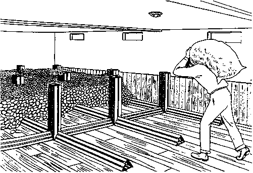 Ducts for ventilation of bulk storage rooms can be laid out vertically as well as horizontally. The storeroom for potatoes shown below provides for plenty of ventilation using simple materials. The room can be of any size or shape since air ducts can be positioned to extend evenly throughout.