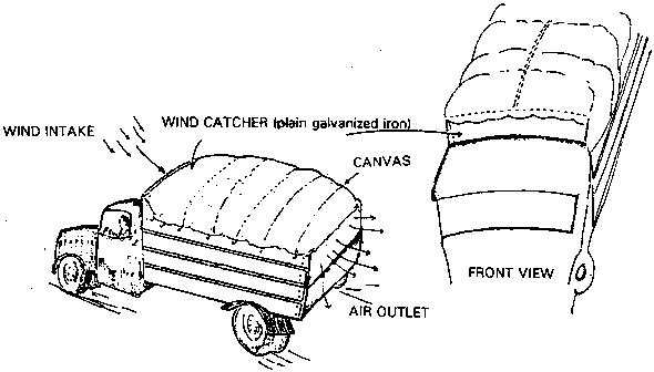 This ventilating system was designed for hauling bulk loads of fresh fava beans in Iran. The wind catcher and ducts were constructed using wooden crates. After removing their end panels the crates were wired together into the pattern shown below. Air flows upward through the load during transport, helping to keep the produce from overheating. This system has also been used in pick-up trucks, and for hauling bulk greens and green beans. Best results are obtained when transporting during the early morning hours, before sunrise.