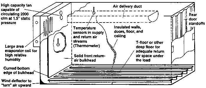 For optimum transport temperature management, refrigerated trailers need insulation, a high capacity refrigeration unit and fan, and an air delivery duct. The illustration below shows these and other desired features in a top-air delivery trailer.