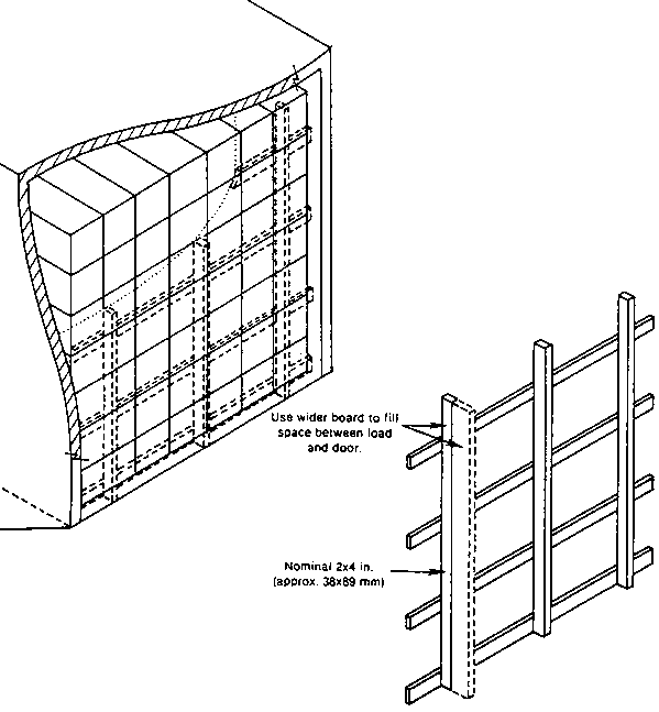 There should always be a void between the last stack of produce and the back of the transport vehicle. The load should be braced to prevent shifting against the rear door during transit. If the load shifts, it can block air circulation, and fallen cartons can present great danger to workers who open the door at a destination market. A simple wooden brace can be constructed and installed to prevent damage during transport.
