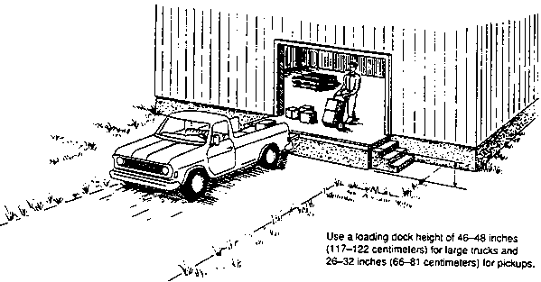 For large trucks, a loading dock 117 to 122 cm high (46 to 48 inches) functions well, while for small trucks or pickups a height of 66 to 81 cm (26 to 32 inches) is recommended.