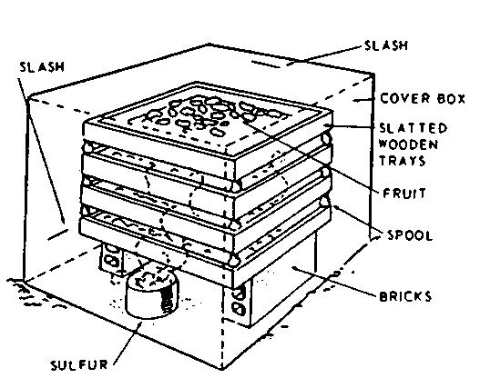 A low cost sulfuring box can be constructed from a large cardboard box that is slashed in several places to allow adequate ventilation. Trays for drying be stacked using bricks and wooden spools as spacers. The trays must be made completely of wood, since sulfur fumes will corrode metal The entire assembly must be located out of doors, preferably on bare soil.