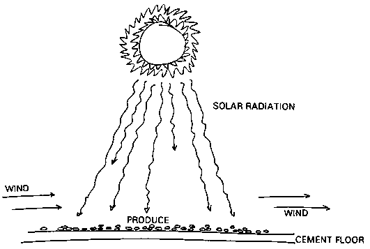 Horticultural produce can be dried using direct or indirect solar radiation. The simplest method for solar drying is to lay produce directly upon a Hat black surface and allow the sun and wind to dry the crop. Nuts can be dried effectively in this way.