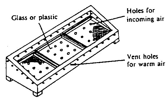 Indirect driers are constructed so the sun shines upon a solar collector (a shallow box, the insides painted black, topped with a pane of glass) heating air which then moves upward through a stack of four to six trays loaded with produce.