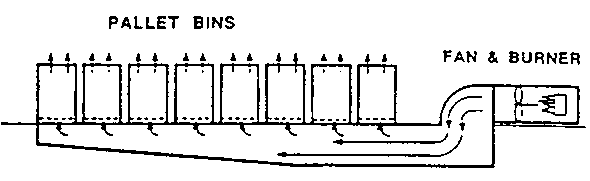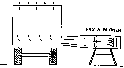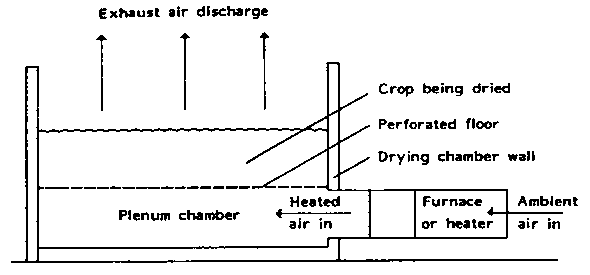 The batch-dryer illustrated below is constructed of wood, has an axial type fan and burns kerosene or diesel oil. A wide variety of dryers are available from manufacturers around the world.