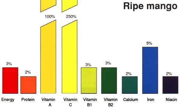 Ripe mangoes are an excellent source of Vitamin A, which is needed for proper growth, healthy eyes and protection -from disease. Green mangoes contain smaller amounts of Vitamin A. Mangoes are high in Vitamin C as well. Vitamin C keeps the body tissues strong, helps the body to use iron, and aids in chemical actions in the body. The amount of Vitamin C is different in different kinds of mangoes, but a green mango usually has more than a ripe one. Children who eat green mangoes will get a lot of Vitamin C, but because green mangoes are hard to digest, they may also get upset stomachs.