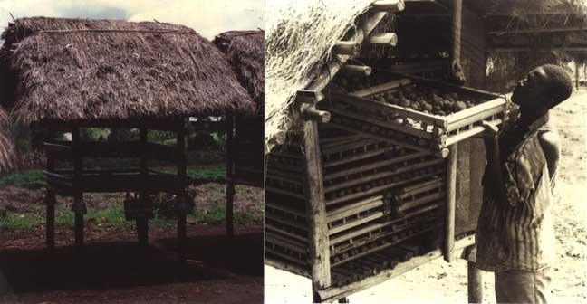 The commonest type of yam store in West Africa is the yam barn (Figure 4.2). The barn is built on open ground but is usually, at least partially, shaded. There are many variations in the type of structure but basically it consists of walls of vertical timbers, each 5-10 cm in diameter, 2 to 3 metres high and set about one meter apart. The vertical timbers are often made of sawn trees which, if left unbarked, will take root when set in the ground (Bencini 1991, Ezeike 1995). It is considered this will reduce the risk of attack by termite or rotting of the timber at ground level. (The grown timbers will also help to provide shade.) In between the vertical timber are cross members of lighter section timber, bamboo or similar material. The barns are covered with a straw roof and enclosed within a fence or a wall for security. Inside the barn the tubers may be tied individually to the vertical timbers or otherwise arranged to allow maximum air circulation. The maximum storage life of yams in the barn is six months. Losses are reported to be 10% to 15% during the first three months and up to 30% to 50% after six months.