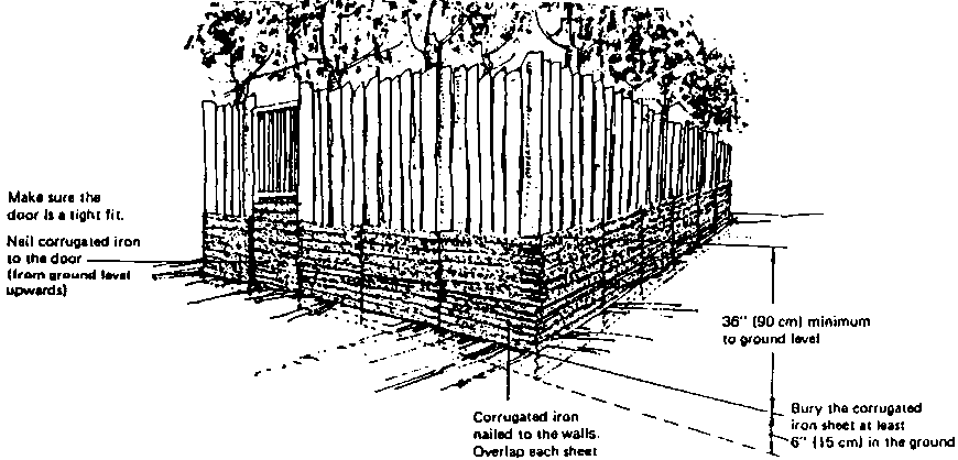 The Nigerian Stored Products Research Institute (NISPRI) recommends a structure similar to the traditional yam barn except that the yam tubers are placed in single layers on shelves instead of being tied to the framework (Figure 4.4). This is a quick, simple operation which allows the yams to be handled more carefully so avoiding the tedium of tying the tubers to the framework and the damage which is associated with it. Shelving also simplifies regular inspection and the removal of rotting tubers. The recommendations also include that a well ventilated shed be constructed over the shelves to give adequate protection from rain and sunlight. Protection against rodents can be achieved by fixing a barrier of sheet metal sheet or a wall about one metre high around the barn (Figure 4.4). Management of the store requires a weekly inspection, the disposal of rotting tubers and the removal of any sprouts on the tubers. Dipping of tubers in a solution fungicide, such as Benalate, Thiabendazole or Captan is recommended or the control of rot. (NSPRI, 1982).