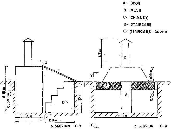 To ensure adequate ventilation across the top of the crop, wire mesh was fitted on top of each long side wall up to the roof eaves on either side of the access door. An entry staircase leading down to the access door had a slopping corrugated aluminium roof which had to be removed to enter the pit. Vertical airflow within the store encouraged by fitting in the centre of the roof structure a chimney 18cm diameter and 1.7m high which was painted black to encourage convective air movement.