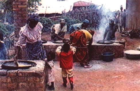 Garification and drying are combined in the "frying" of the gari. At village level gari is fried in shallow cast-iron pans, or in the more traditional areas in earthenware pans, over an open wood fire (Figure 5.8). The sieved cassava mash is spread thinly in the pan in 2-3kg batches. A piece of calabash is often used to press the mash against the hot surface of the pan but it must be scraped quickly and stirred constantly to keep the material moving to prevent it burning until frying is completed when it reaches a temperature of 80° to 85°C. The rapid heating partially gelatinises the gari which is dried during the operation of frying. The process takes 30-35 minutes, with the moisture content of the final product reduced to about 18% (Muchnik and Vivier 1984, Bencini 1991).