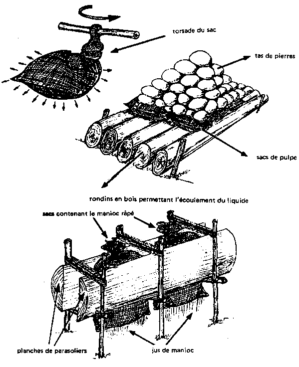 During the fermentation period the container is put under pressure by piling heavy stones on it, by strongly twisting the neck of the sacks and pressing the bag or sack between wooden poles tightened by ropes (Figure 5.6). In the latter cases the bag or sack is re-tightened every day as the liquor flows out of the cassava mash. Neither of these methods is considered as effective as the tipiti as used in South America. In this case the mash is held in a tube of a rather complicated basket weave, the diameter of which expands as it is compressed and shrinks as the tube is extended. One end of the tipiti is secured high in a tree and the other end is fastened to a lever which is subjected to a heavy downward pull by ropes, heavy stones or even by somebody sitting on it (Cock 1985).