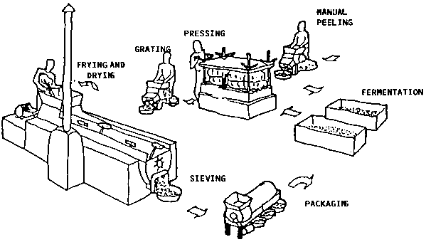 The traditional production of gari is a long and tedious process. Five distinct operations are required: peeling, grating, fermentation and pressing, sieving, frying and drying (Figure 5.4).