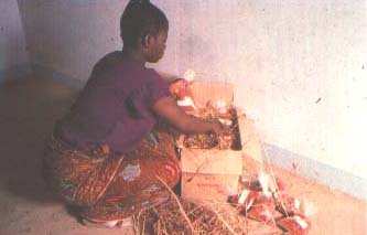 94. The bags of dried tomatoes are kept in cardboard boxes with straw to protect them from damp.