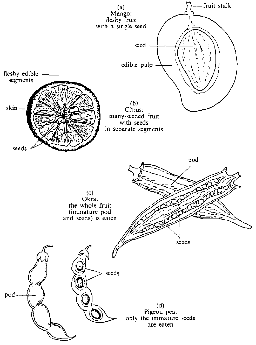 | Immature green pods with partly developed seed | Green beans, yard-long beans (asparagus bean, bodi), okra | (Figure 4.4c) |
