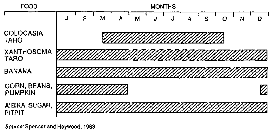 In many lowland areas of Papua New Guinea, rainfall and subsistence agriculture show marked seasonal patterns. Seasonal variation in food supply is considerably reduced by the cultivation of taro, or cocoyam. As shown in Fig. 9.1 the cultivation of two species of cocoyam, Colocasia and Xanthosoma, complement one another in providing a supply of calories throughout the growing season. Banana also, as a non-seasonal producer of calories, helps to even out the food supply and ensures household food security throughout the year.