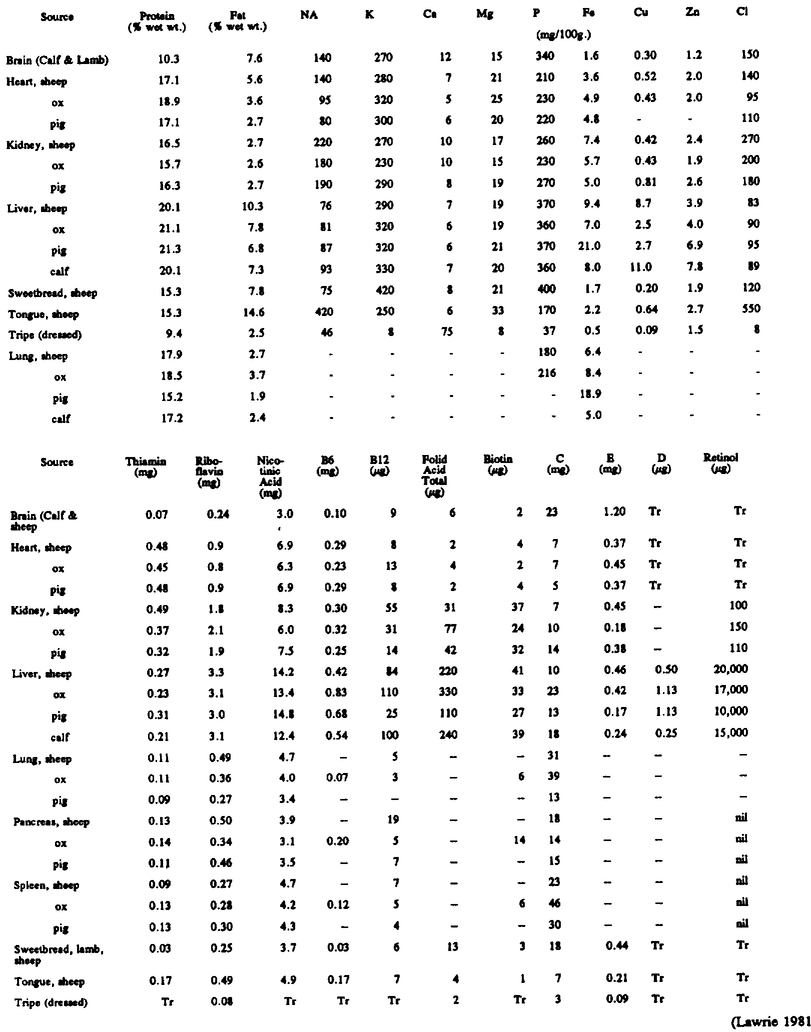 | Ox liver, raw | 69 | 21 | 8 | 160 | 0.7 | 0.25 | 13 |