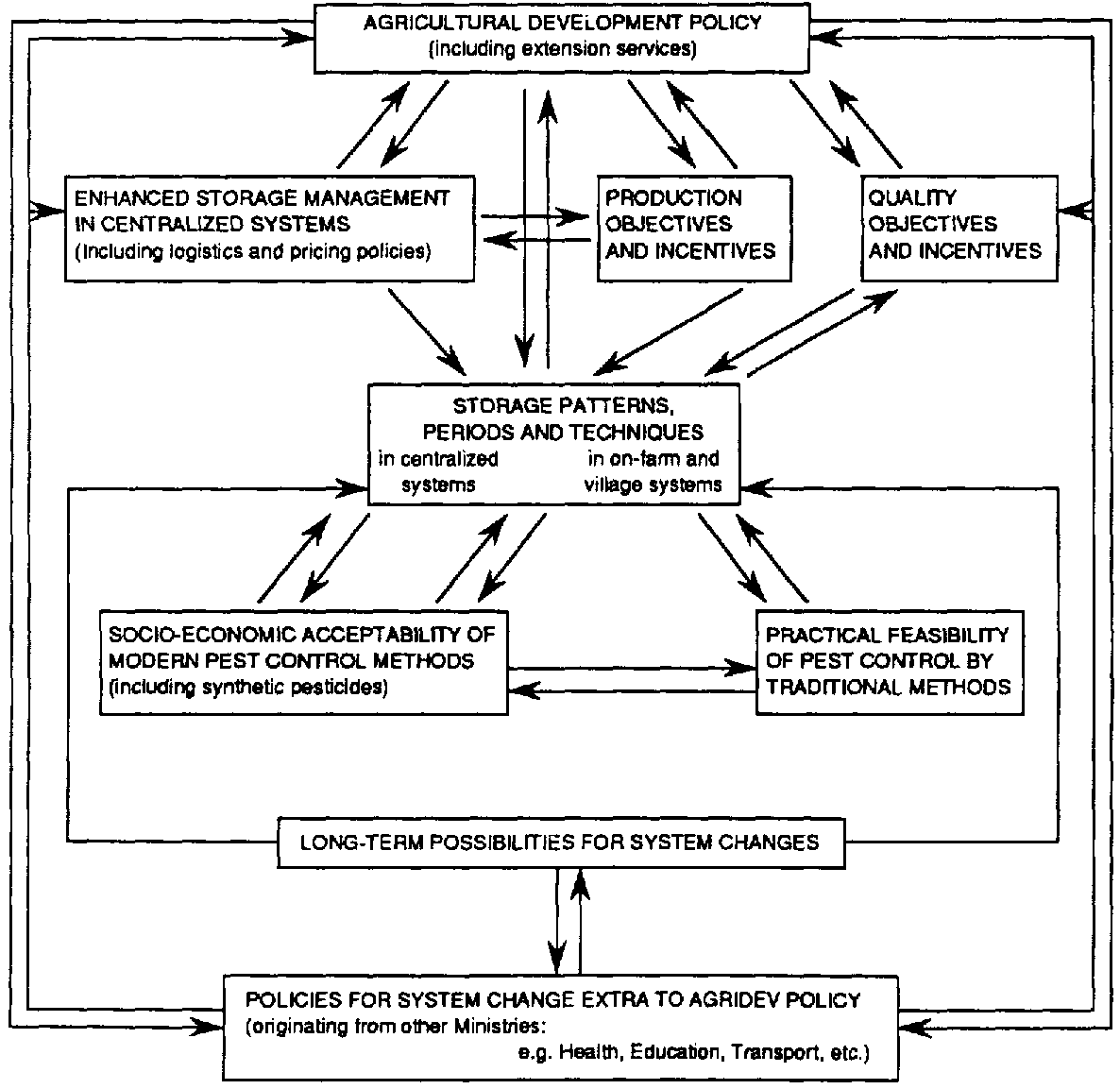 Figure 8.3 draws attention also to socio-economic factors affecting, in particular, the acceptability of control measures. Modern techniques, especially those involving the application of synthetic insecticides to stored grain, are especially prone to consumer sensitivity. However, many traditional techniques face comparable problems. The use of wood ash and other supposedly non-toxic 'natural' grain protectants may not be acceptable in all circumstances, nor even to all those people at the small farm level in developing countries who are often supposed to prefer such treatments.
