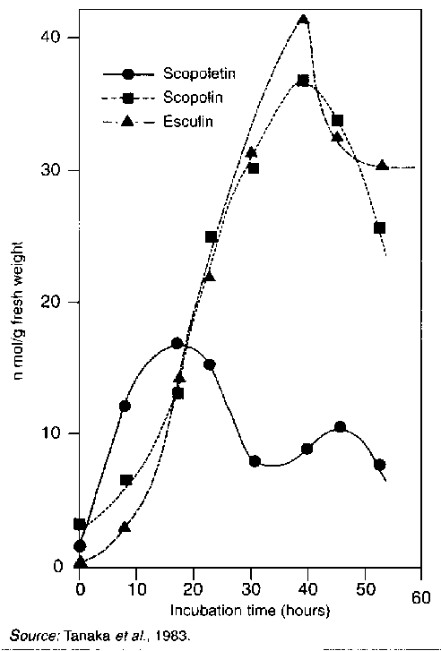 FIGURE 12 Time course of changes in the amounts of coumarin components in cassava (cv. Golden Yellow) in response to cut injury. Tissues disks were 2mm thick.