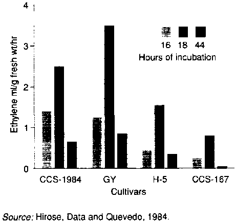 The development of physiological deterioration throughout the storage tissues of cassava root after harvesting suggests the transmission of intercellular signals from the sites of damage. However, this topic has not been studied in cassava except for the production of ethylene. Like most other plant tissues (Hyodo, 1991), cassava has been found to produce ethylene in response to wounding. Ethylene production from damaged cassava roots was reported to occur after a lag period of about six hours and continued to increase over a 22hour period (Plumbley, Hughes and Marriott, 1981). Similar results were obtained by Hirose, Data and Quevedo ( 1984) after a lag phase of 16 hours with varietal differences affecting the rate of ethylene production (Figure 15). Experimental evidence to date suggests that ethylene is not directly involved in the development of physiological deterioration. Preharvest pruning, which is effective in suppressing physiological deterioration, had no significant influence on ethylene production following injury and the application of endogenous ethylene was not found to affect wound responses (Hirose, Data and Quevedo, 1984).