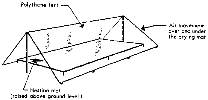 The principles for the shade drying are the same as for sun drying. The material to be dried requires full air circulation. Therefore, shade drying is carried out under a roof or thatch which has open sides; it CANNOT be done either inside conventional buildings with side walls or in compounds sheltered from wind. Under dry conditions when there is a good circulation of air, shade drying takes little more time than is normally required for drying in full sunlight.