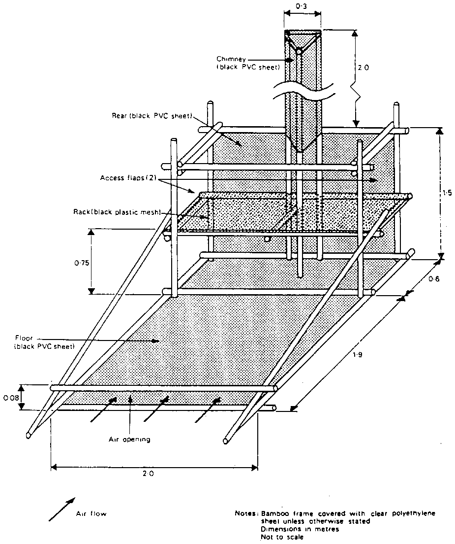 Careful design in the development stage of a dryer can often facilitate the use of cheaper materials. Difficulties caused by these materials are in joining pieces of the structure, in sealing the structure against air leaks, and in attaching the plastic sheet to the (wooden) frame. There is obvious scope for designs which use prepared timber for strategic points and unprepared at others.