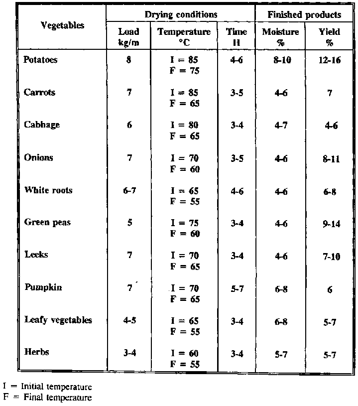 General technical data for vegetable dehydration in tunnels are shown in table 9.4.1.