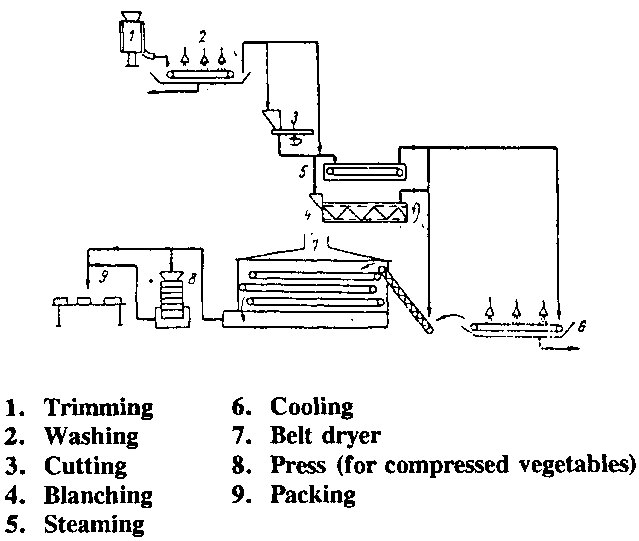 A schematic flow-sheet for vegetable dehydration in belt driers is seen in Fig. 9.4.1.