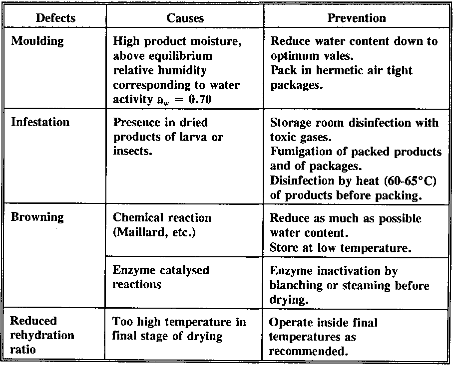 TABLE 9.4.3 Dehydrated vegetable potential defects and means to prevent them