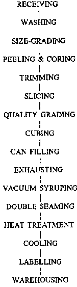 Fruit is size graded and the crown removed. It is then washed thoroughly and prepared, which includes peeling, coring, slicing and punching. Slices are then graded for size, colour and maturity. Slices should be free from peels and eyes. Each can is filled with slices of the same size and colour. The filled cans are syruped hot, exhausted, sealed, processed, cooled, labelled and packaged.