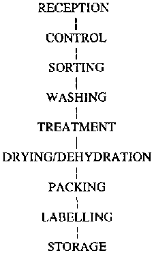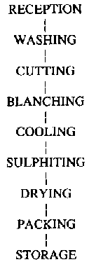 Blanching is performed by dipping for 3 minutes in boiling water containing 50 g salt per litre of water. After cooling, sulphiting is carried out by dipping in a solution containing 3 g potassium metabisulphite per litre of water, during 3 minutes.