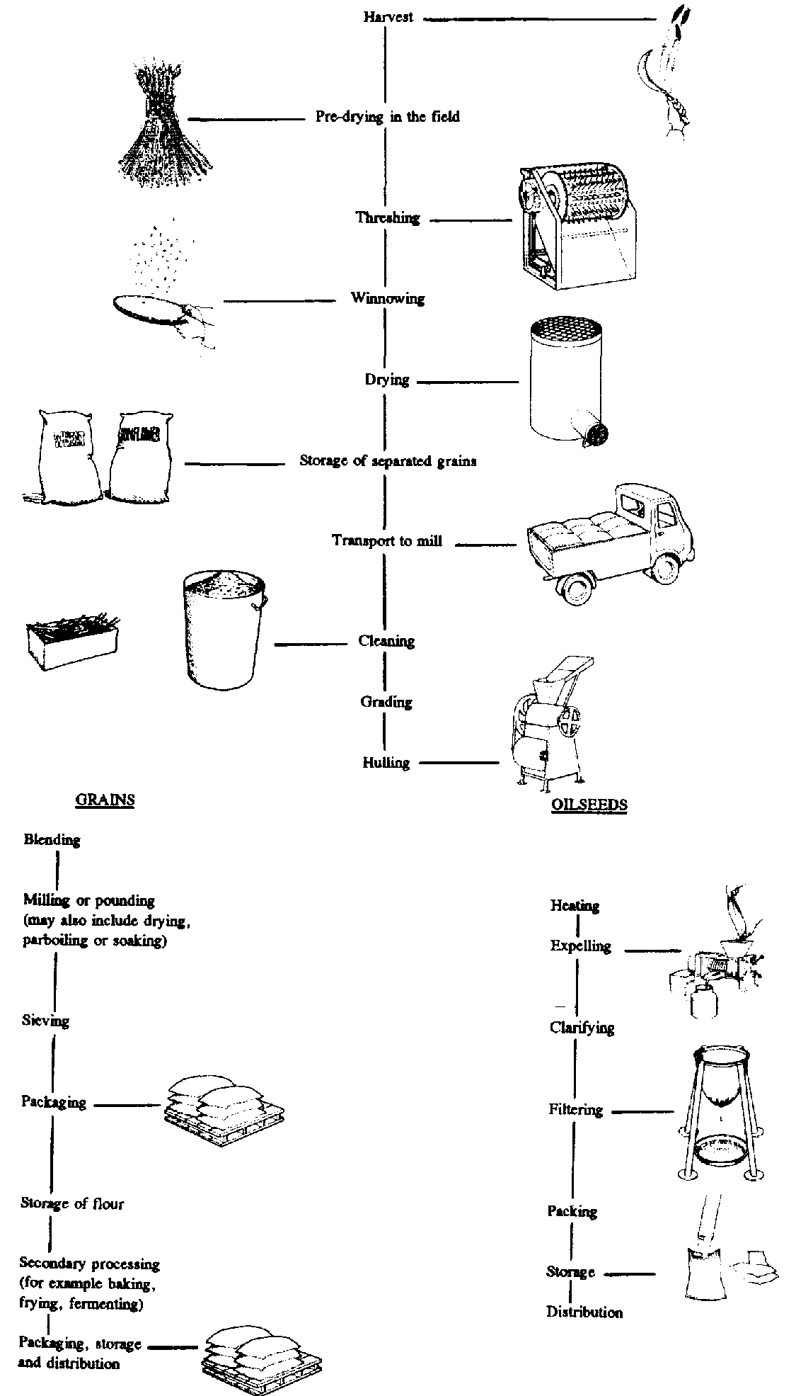 All cereals may pass through a long chain of unit operations from harvest to final consumption and sometimes this chain may be very complex and involve a large number of people. An example of such a post-harvest chain is shown in Fig. 11 (see Figure 11: Process Flow diagram for cereal and oilseed milling). There are three main parts to the chain; harvesting and storage, primary processing, after which the grain is still not edible and secondary processing to convert the grain to an edible form.