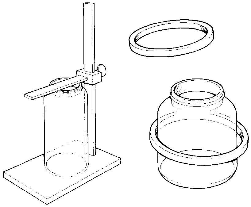 The important routine checks are to measure the height of containers, their neck diameter and outside diameter, and their ovality (to ensure that they are round and not oval). Simple equipment may be manufactured to perform these checks (Figure 42: Simple equipment for checking glass containers: a) height measurement, and b) go/no-go rings). A vertical ruler on a stand is used to measure height. Different "go/no-go" rings can be made for each size of container that is used. Rings are slipped over the neck of a container to quickly show whether the diameter is too large or too small for the intended lid and also to show if the neck is not circular. Different sized rings can similarly be used to check the outside diameter of the container and its ovality.
