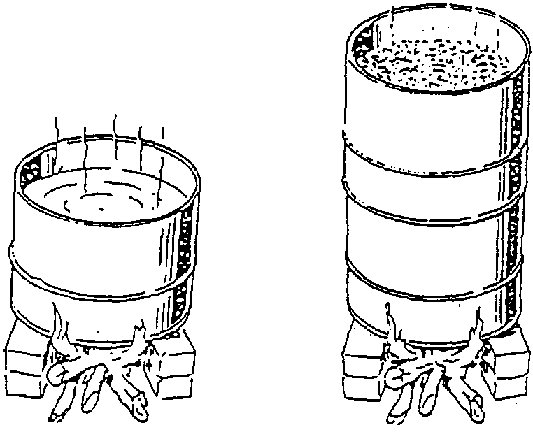 A parboiling technique was introduced based on a very simple method (Figures 3.5 and 3.6). A 200-litre metal drum is cut into two half drums. The upper half drum, the bottom of which is pierced with small holes, and which contains the paddy, is placed on top of the second half drum containing boiling water. A hearth of clay bricks minimises wood consumption (15kg of wood for 50kg of paddy).