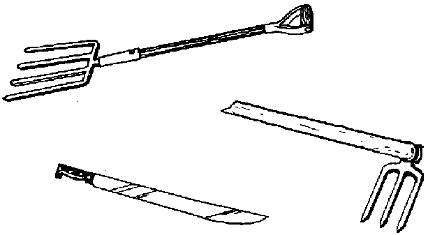 Tools used to lift root crops are a matter of personal choice and/or tradition. As shown in Figure 3.3. (see Figure 3.3. Harvesting tools for root crops) below, they include: digging sticks, cutlasses (machetes), hoes or digging forks. Always use sharp instruments with great care so as not to wound or cut the produce because this will give rise to rapid spoilage by soil-borne pathogens.