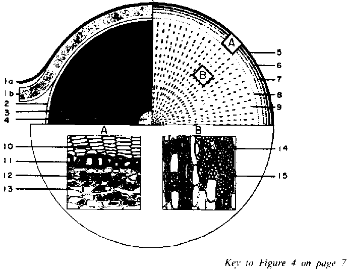 Clusters of root of the Bogor variety, ripe for harvesting, are shown in Figure 3. A cross section of the root is given in Figure 4. The peel consists of an outer and an inner part, the former comprising a layer of cork cells and the phellogen. The cork layer, generally dark-coloured, can be removed by brushing in water, as is done in the washers of large factories. The inner part of the peel contains the phelloderm and the phloem, which separates the peel from the body of the root. The texture of the transition layer makes possible an easy loosening of the whole peel from the central part, thus facilitating the peeling of the roots.